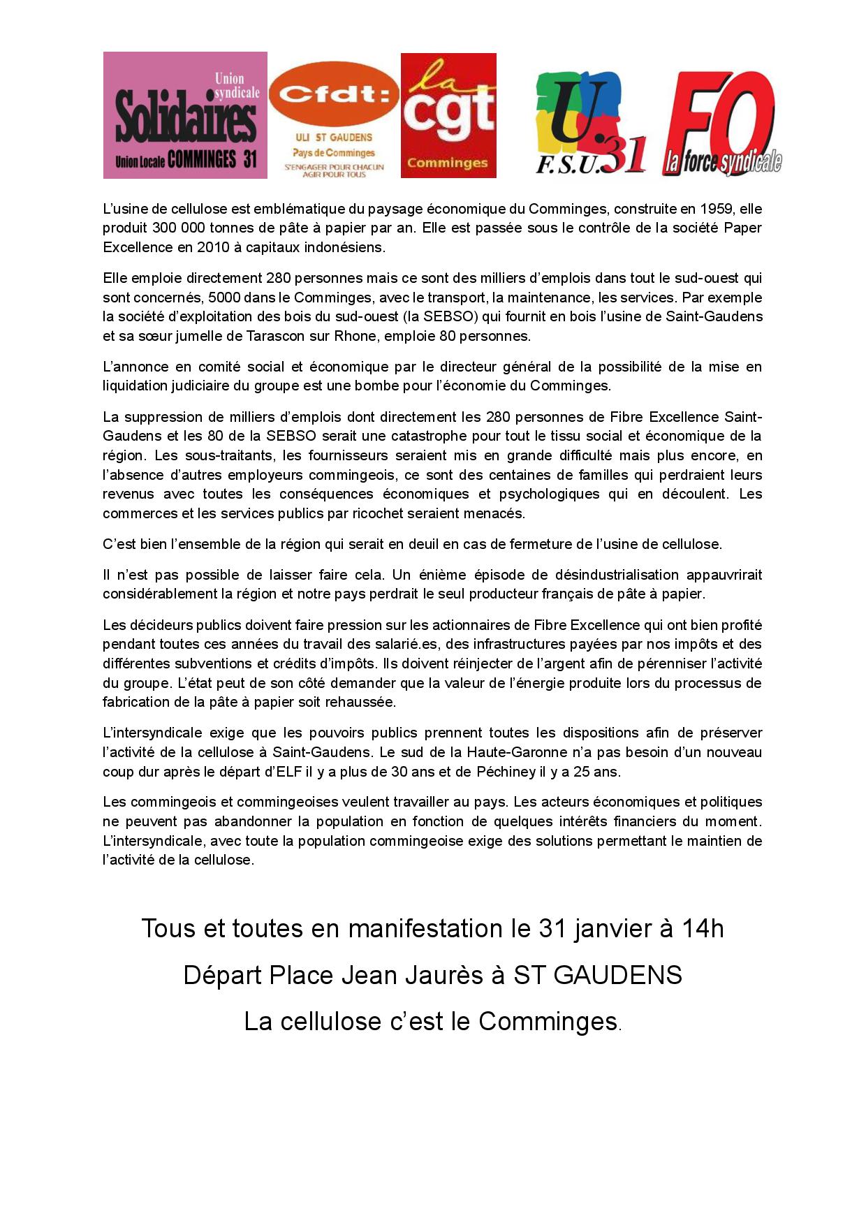 Les commingeois et commingeoises veulent travailler au pays. Les acteurs économiques et politiques ne peuvent pas abandonner la population en fonction de quelques intérêts financiers du moment. L’intersyndicale, avec toute la population commingeoise exige des solutions permettant le maintien de l’activité de la cellulose.